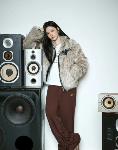 系列造型以多層次結構和份量剪裁為主軸:由寧寧演繹的仿毛外套帶來柔軟卻不失線條的輪廓感;皮革飛行羽絨外套則以俐落外型呈現品牌的摩登態度;寬版下身輪廓與沉穩深色調相互呼應,使整體風格散發獨立、鮮明而乾淨的力量感。搭配本季亮點配飾—極具存在感的皮革手袋、細節精緻的毛絨吊飾與冷感金屬配件,勾勒出 MATIN KIM 對城市冬季風格的現代詮釋。